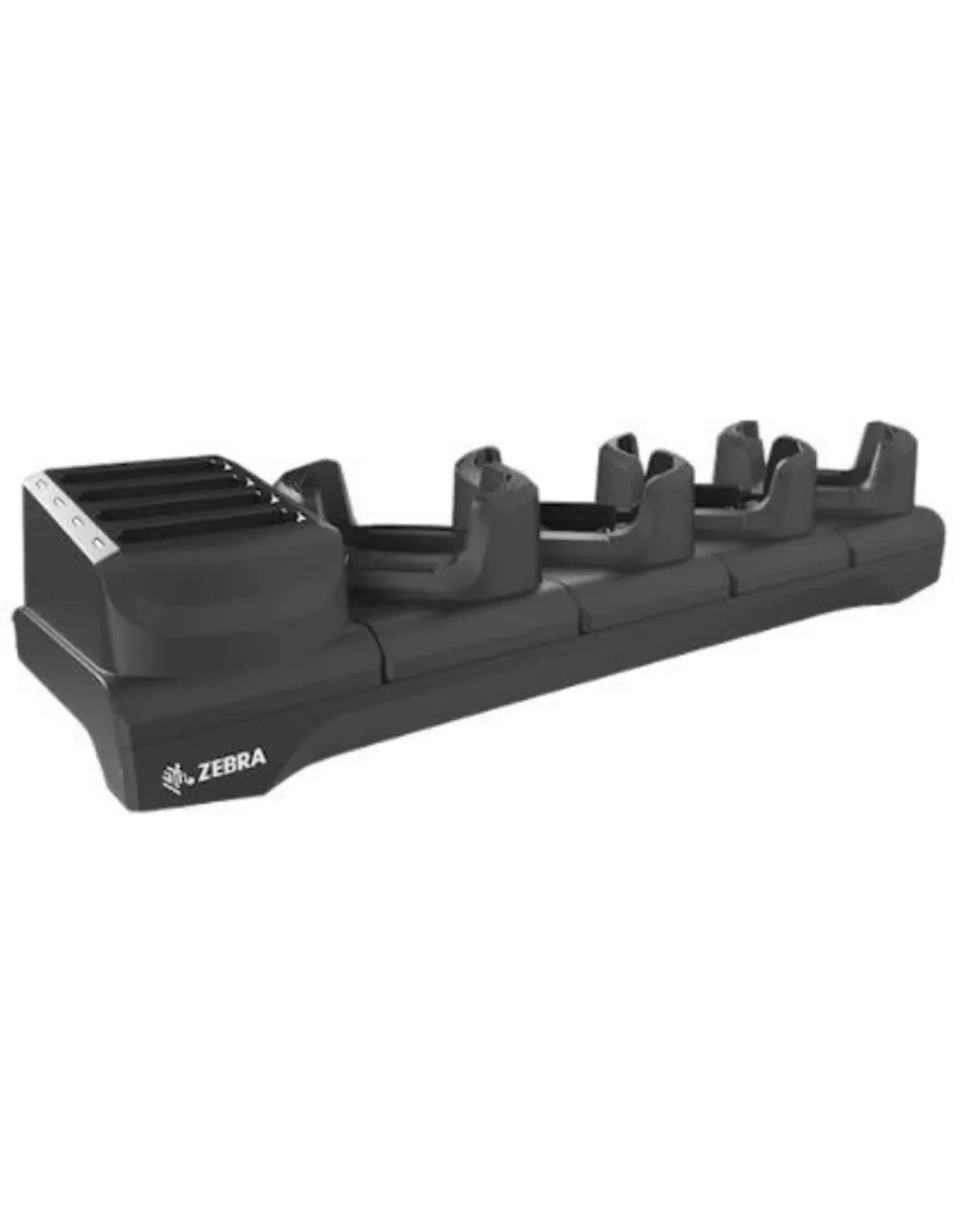 Stacja dokująca z wieloma gniazdami do ładowania do czterech urządzeń FR55, TC53/TC58, TC53e/TC58e/TC53e-RFID oraz czterech baterii, zawiera szare podkładki dla urządzeń z bootem, zasilacz PWR-BGA12V108W0WW, kabel DC oraz krajowy kabel AC sprzedawane oddzielnie